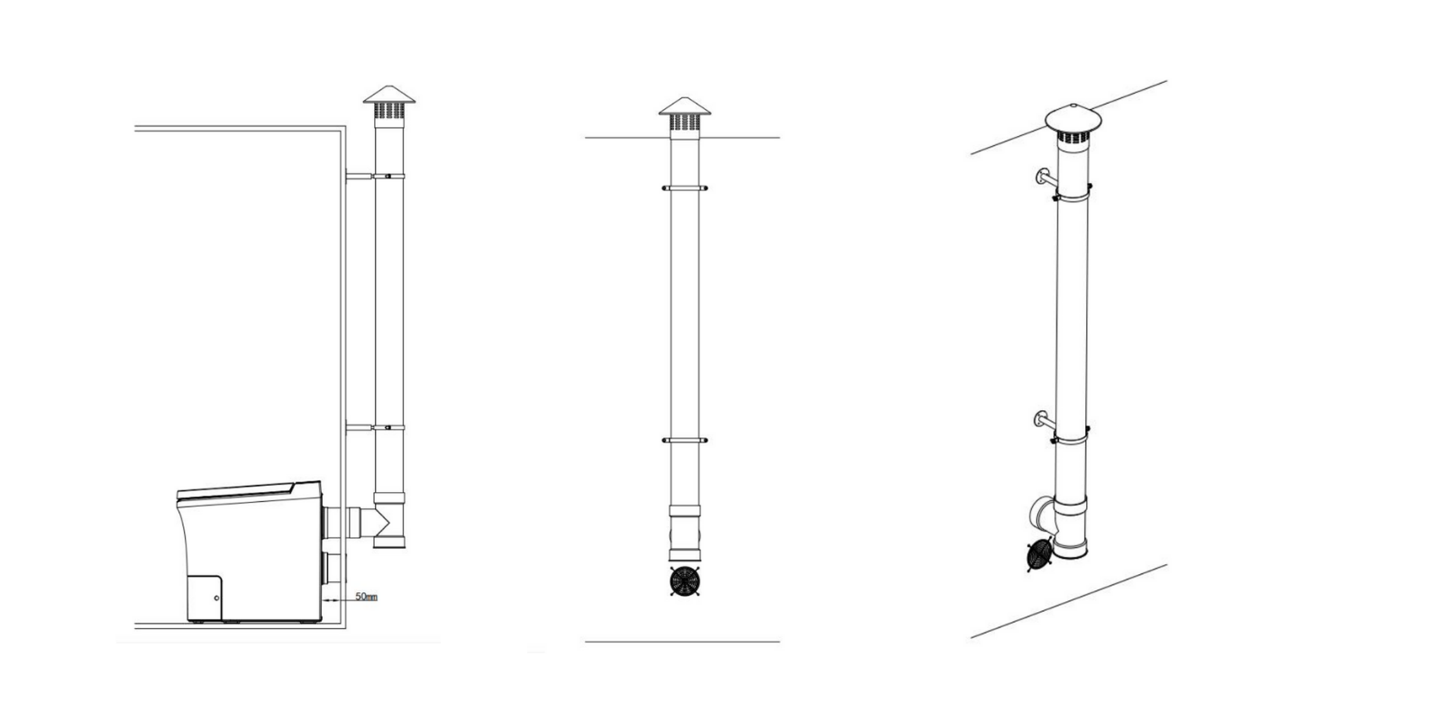 - Install the cut exhaust pipe between the incineration toilet and the wall.