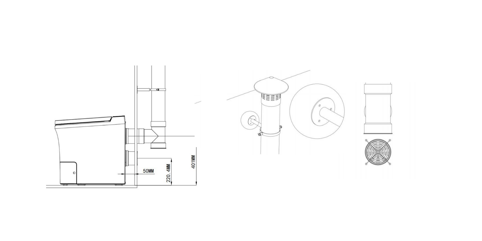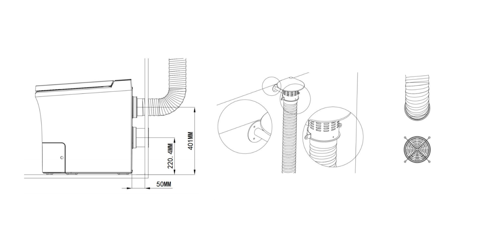 - Then, pass the exhaust hose and intake pipe through the holes respectively, fixing them between the toilet and the wall.